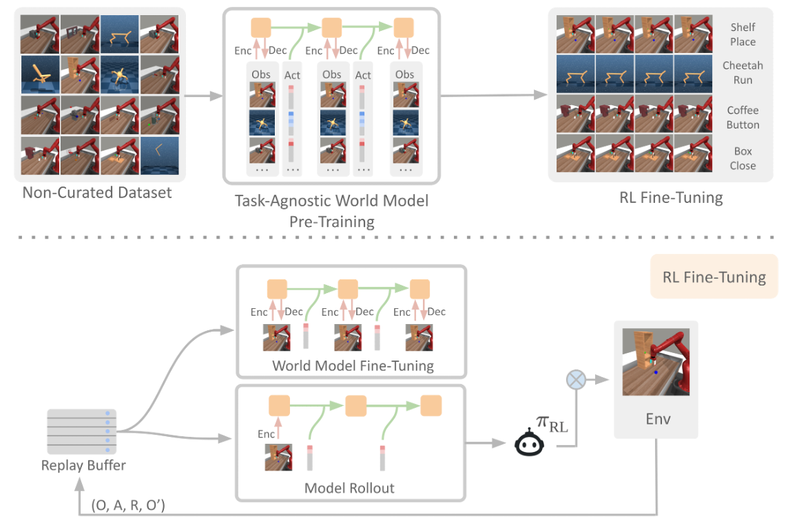 Leveraging offline data is a promising way to improve the sample efficiency of online reinforcement learning (RL). This paper expands the pool of usable data for offline-to-online RL by leveraging abundant non-curated data that is reward-free, of mixed quality, and collected across multiple embodiments. Although learning a world model appears promising for utilizing such data, we find that naive fine-tuning fails to accelerate RL training on many tasks. Through careful investigation, we attribute this failure to the distributional shift between offline and online data during fine-tuning. To address this issue and effectively use the offline data, we propose two techniques: i) experience rehearsal and ii) execution guidance. With these modifications, the non-curated offline data substantially improves RL's sample efficiency. Under limited sample budgets, our method achieves nearly twice the aggregate score of learning-from-scratch baselines across 72 visuomotor tasks spanning 6 embodiments. On challenging tasks such as locomotion and robotic manipulation, it outperforms prior methods that utilize offline data by a decent margin.